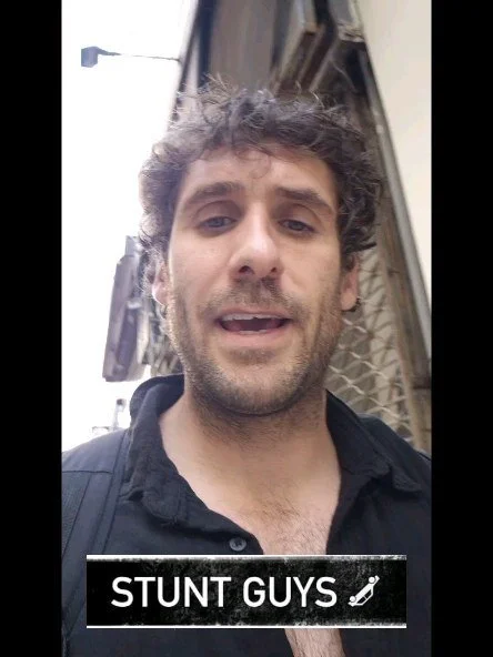 Un groupe de personnes, dont Quentin Morlaas avec une cagoule, est dans une pièce, avant de tourner une scène de cascade.