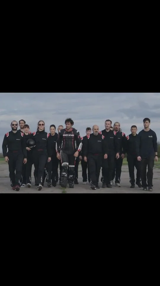 Un groupe de personnes, dont Quentin Morlaas avec une cagoule, est dans une pièce, avant de tourner une scène de cascade. Voir en taille réelle